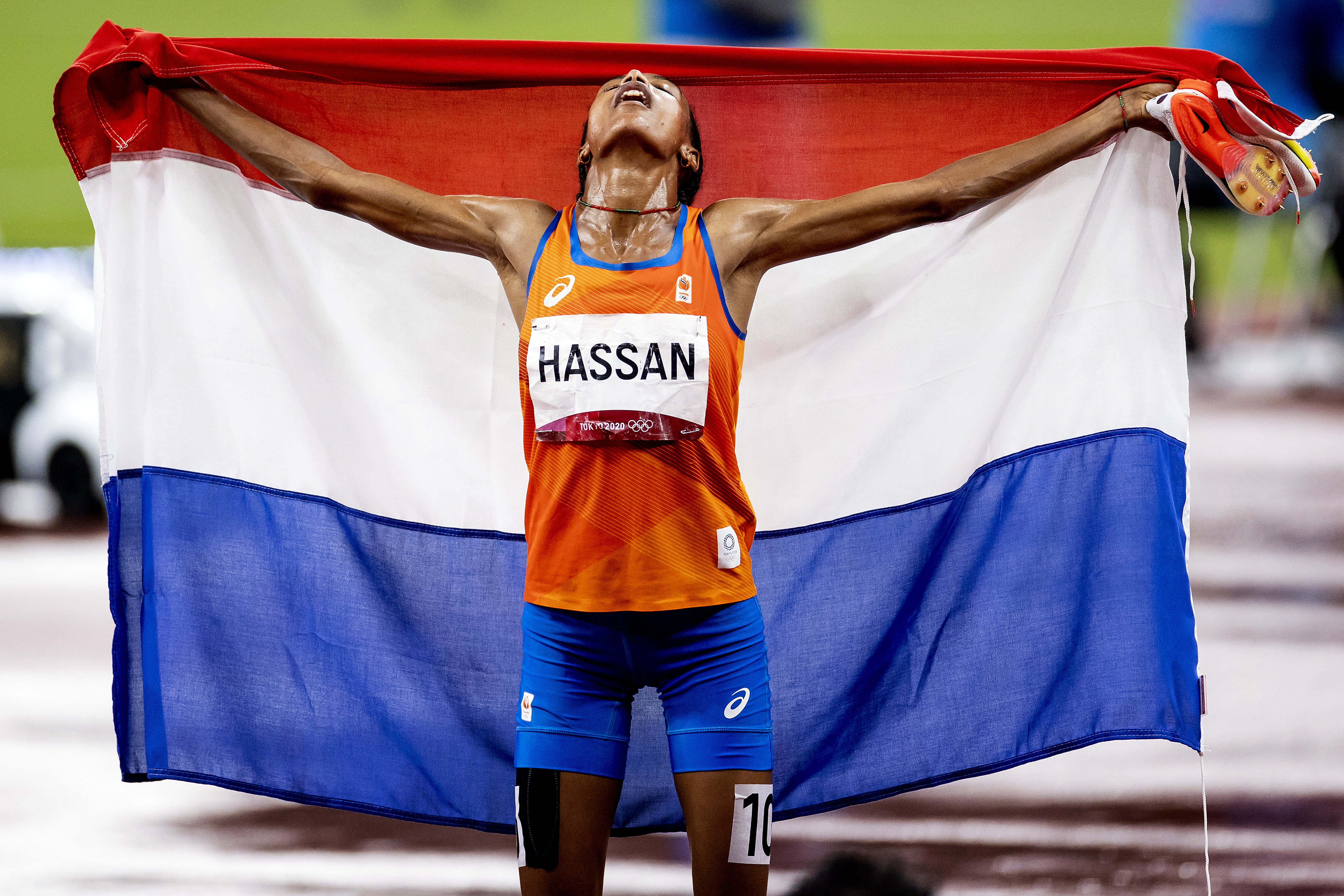 Sifan hassan draagt zondag tijdens de sluitingsceremonie van de olympisch spelen de nederlandse vlag het olympisch stadion van tokio binnen, zo hassan won afgelopen maandag op de 5000 meter het eerste atletiekgoud voor nederland sinds ellen van langen op de spelen van barcelona in 1992.